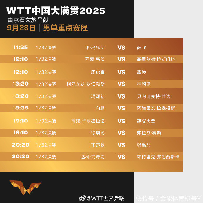 2025年WTT中国大满贯是一项规格很高的赛事,本次比赛,中国队派出两位宇宙第一王楚钦、孙颖莎领衔的执意声势出战,而况他们在正赛第一轮首个比赛日就联袂登场。 稍早前的WTT澳门冠军赛,王楚钦与孙颖莎双双夺冠,现在现象正佳。背靠背的中国大满贯,中国男乒派出16东谈主的巨大声势出战,包括王楚钦、林诗栋、梁靖崑、林高远等主力球员。 也有向鹏、陈垣宇、周启豪、薛飞、黄友政、温瑞博、徐瑛彬这些争夺主力声势的球员。另外还有徐海东、袁励岑、周恺、陈俊菘、李和宸等需要干预阅历赛的这些二线球员。