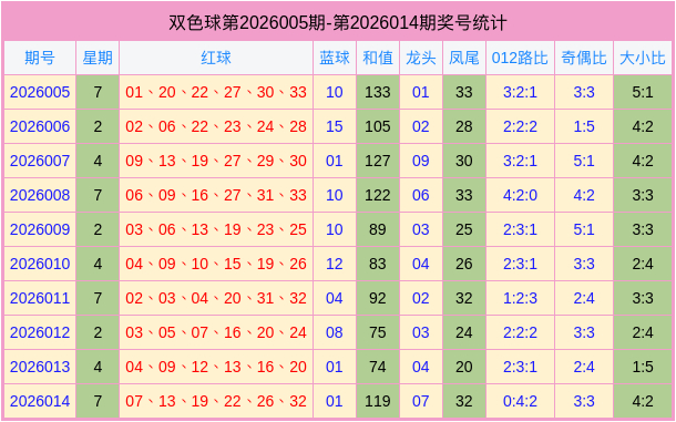 当期红球号码012路比为0:4:2,奇偶比为3:3,大小比为4:2。蓝球则是开突出数号码01。 谭曙光双色球第2026015期全维度分析