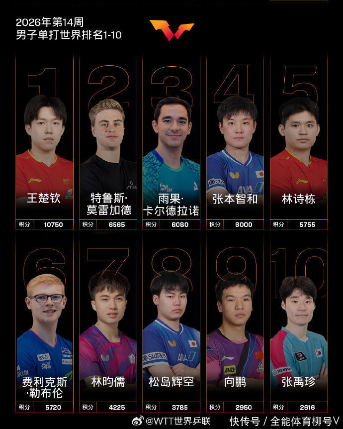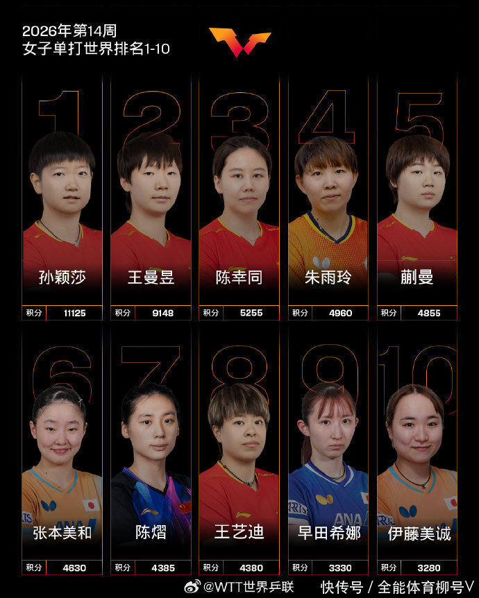而打进八强的印度选手玛纳什-沙其宇宙排名飞腾12个位次来到第52;另一位打进八强选手弗拉基米尔-西多伦科其宇宙排名飞腾8个位次来到第35,创造个东谈主办事糊口排名新高。男单宇宙排名中,王楚钦无间高居第一位,林诗栋第五,向鹏第八。 其他中国队选手的宇宙排名为:梁靖崑第13、温瑞博第17、周启豪第23、陈垣宇第24、陈俊菘第37。